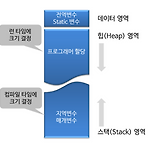 1. C http://dsnight.tistory.com/50 -프로그램을 실행시키면 운영체제는 실행시킨 프로그램을 위한 메모리 공간을 할당 -할당되는 메모리 공간은 크게 스택, 힙, 데이터 영역으로 나뉨 -각 메모리 공간은 목적에 따라 할당되는 시점, 장소가 다름 1) 데이터 영역 -전역변수와 static 변수가 할당 -프로그램의 시작과 동시에 할당되고, 프로그램이 종료되어야 메모리에서 소멸 2) 스택 영역 -함수 호출 시 생성되는 지역 변수와 매개 변수가 저장 -함수 호출이 완료되면 사라짐 3) 힙 영역 -필요에 의해 동적으로 메모리를 할당할 때 사용 -배열을 프로그램 런타임에 메모리 크기를 결정하고 싶을 때 동적할당을 통해 힙 영역 할당 2. Java http://ojc.asia/bbs/board...